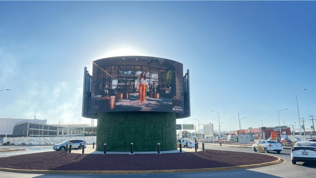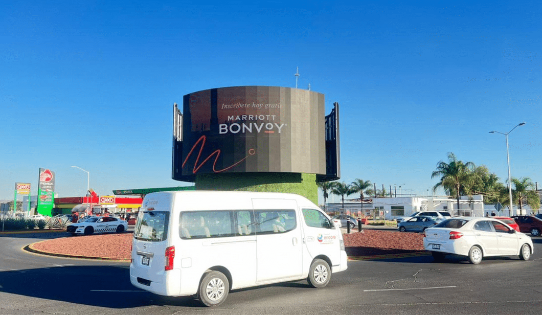 Pantallas colocadas en lugares de alta visibilidad como centros comerciales, avenidas principales y estaciones de transporte.